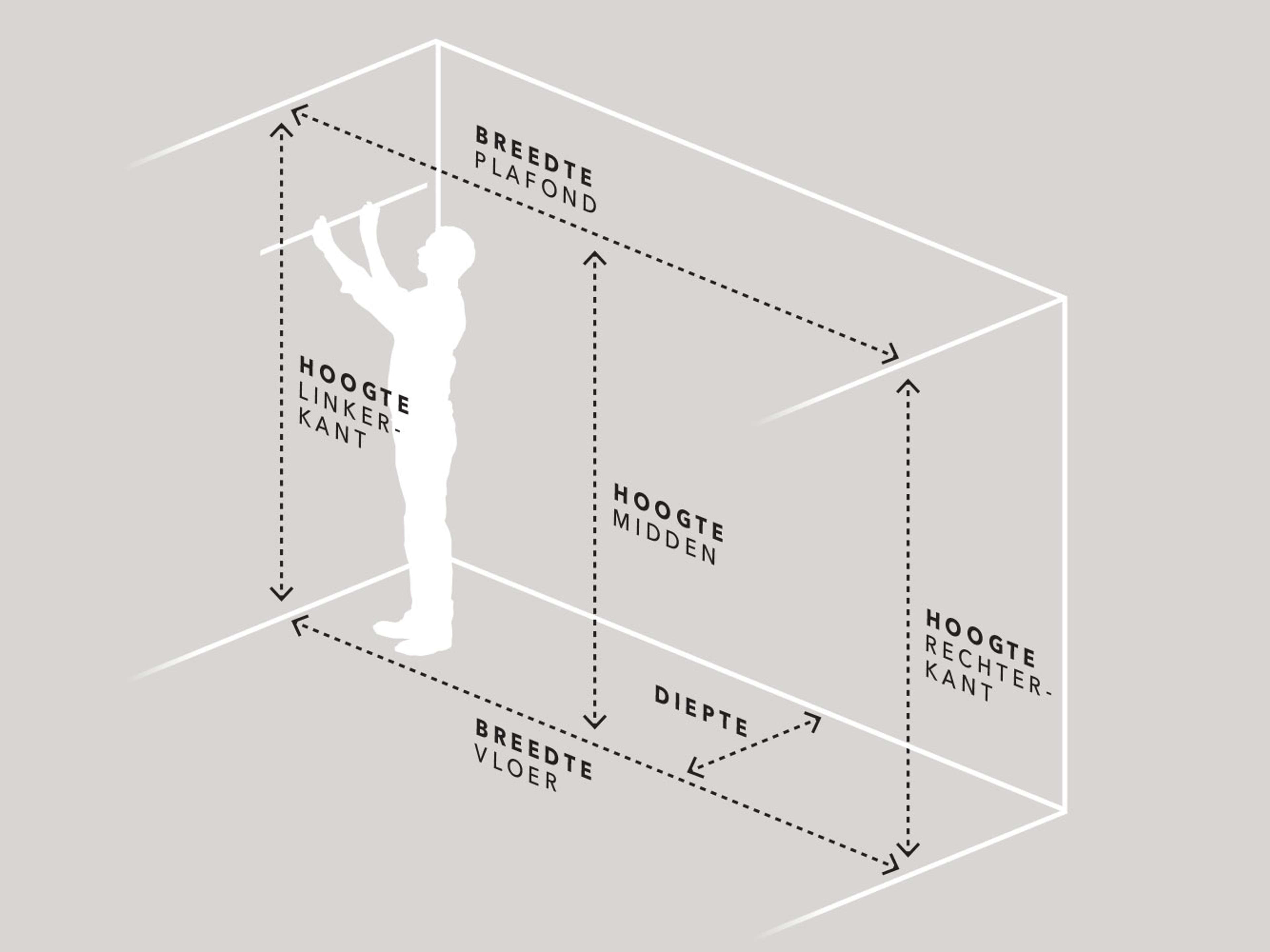 - Breedte – wordt gemeten bij de vloer en het plafond om erachter te komen of de muren scheef staan. De laagste maat bepaalt de breedte.