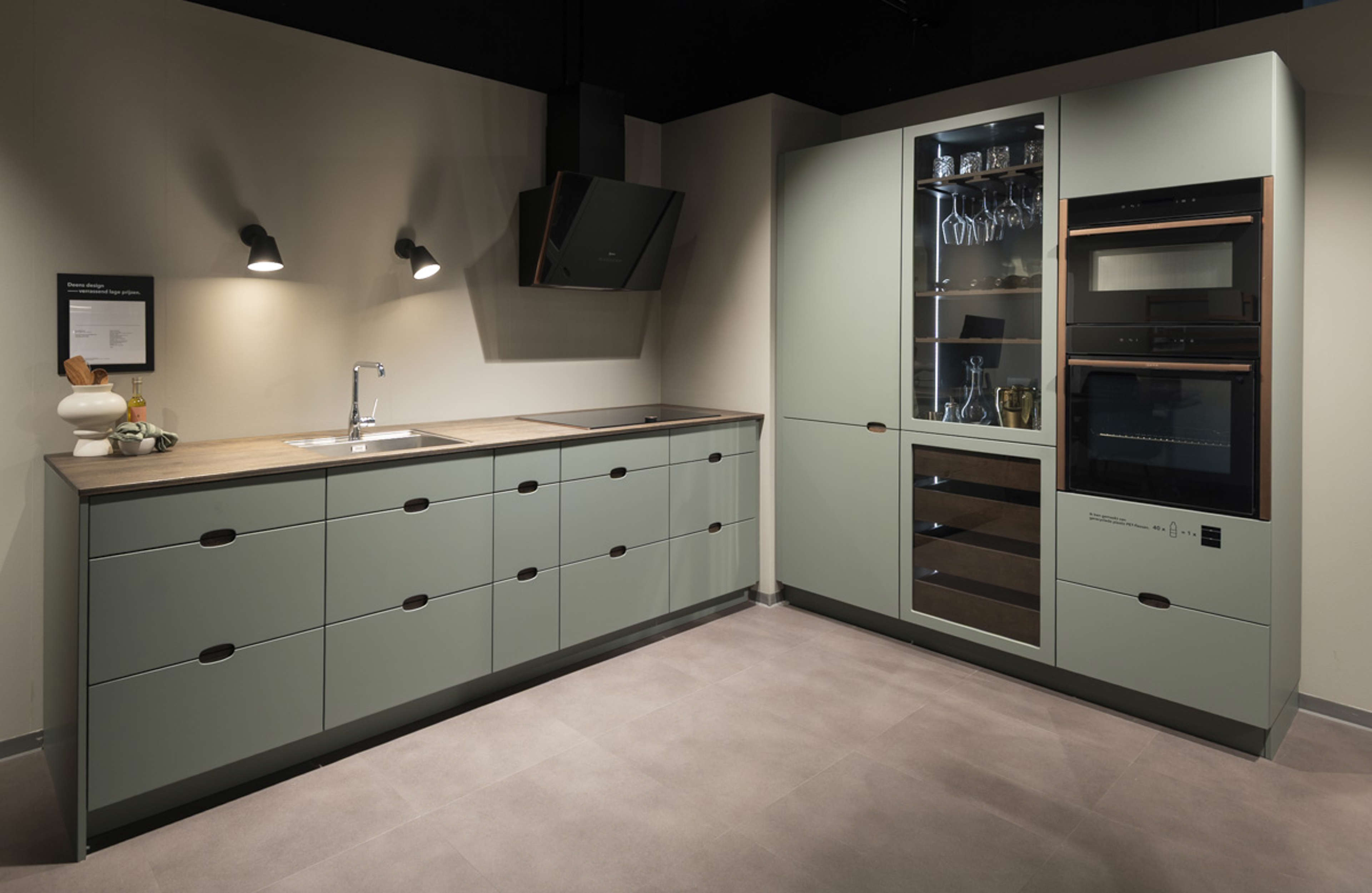 o Kleur en materiaal kasten: Groen mat met donker eiken interieur