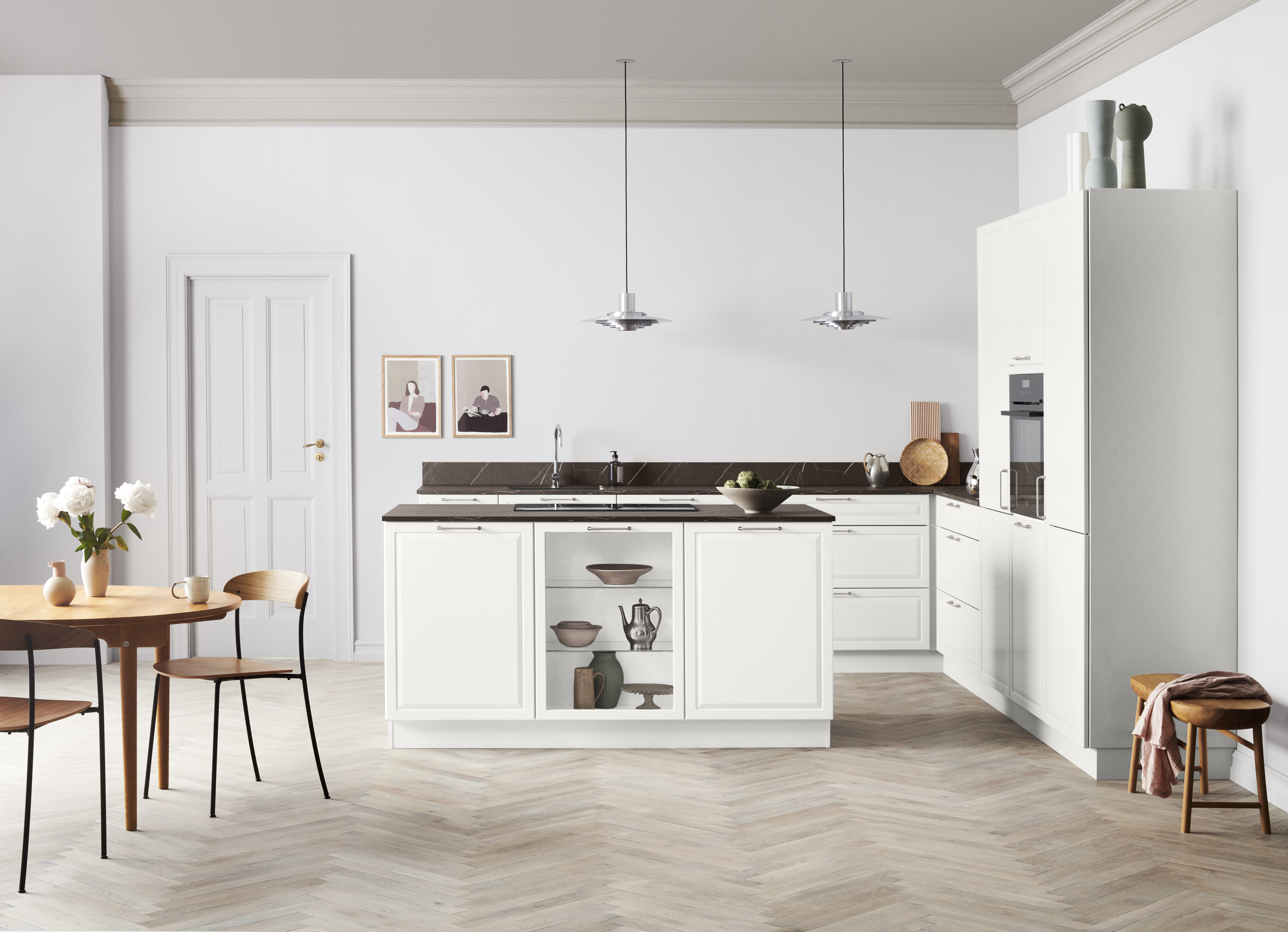 Combineer idyllische landelijke stijl met Deens design en geef je keuken een moderne uitstraling. Voeg een element toe van de klassieke landelijke keuken met een open kast, en creëer tegelijkertijd een kalme balans met de strakke lijnen van je keuken.